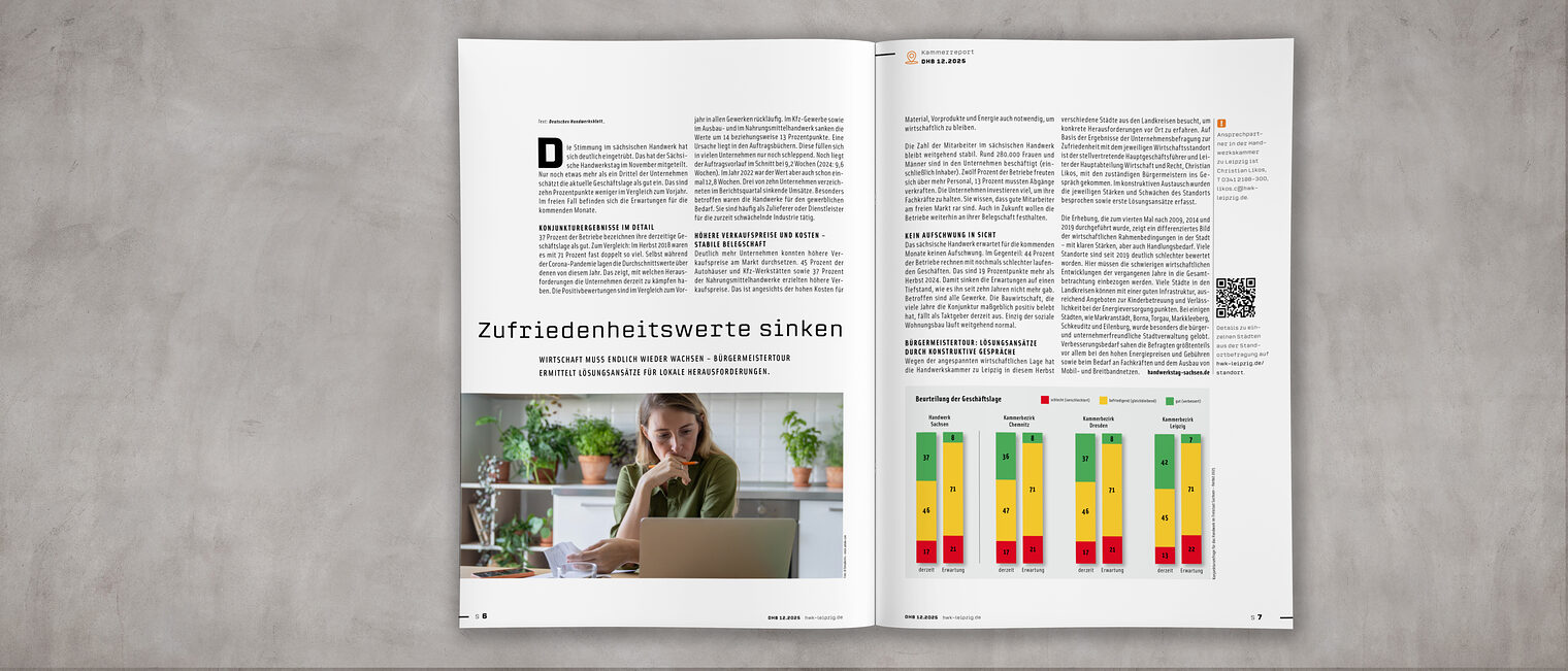 +++ Zufriedenheitswerte sinken +++ Schornsteinfeger bringen nicht nur anderen Glück +++ Verpackungssteuer auch für Leipzig? +++ Unternehmensgründung via Zeitungsannonce +++ Restaurierung trifft Zukunft – Staatspreis Ländliches Bauen 2026 startet +++ Nachlassregelung im Handwerk +++