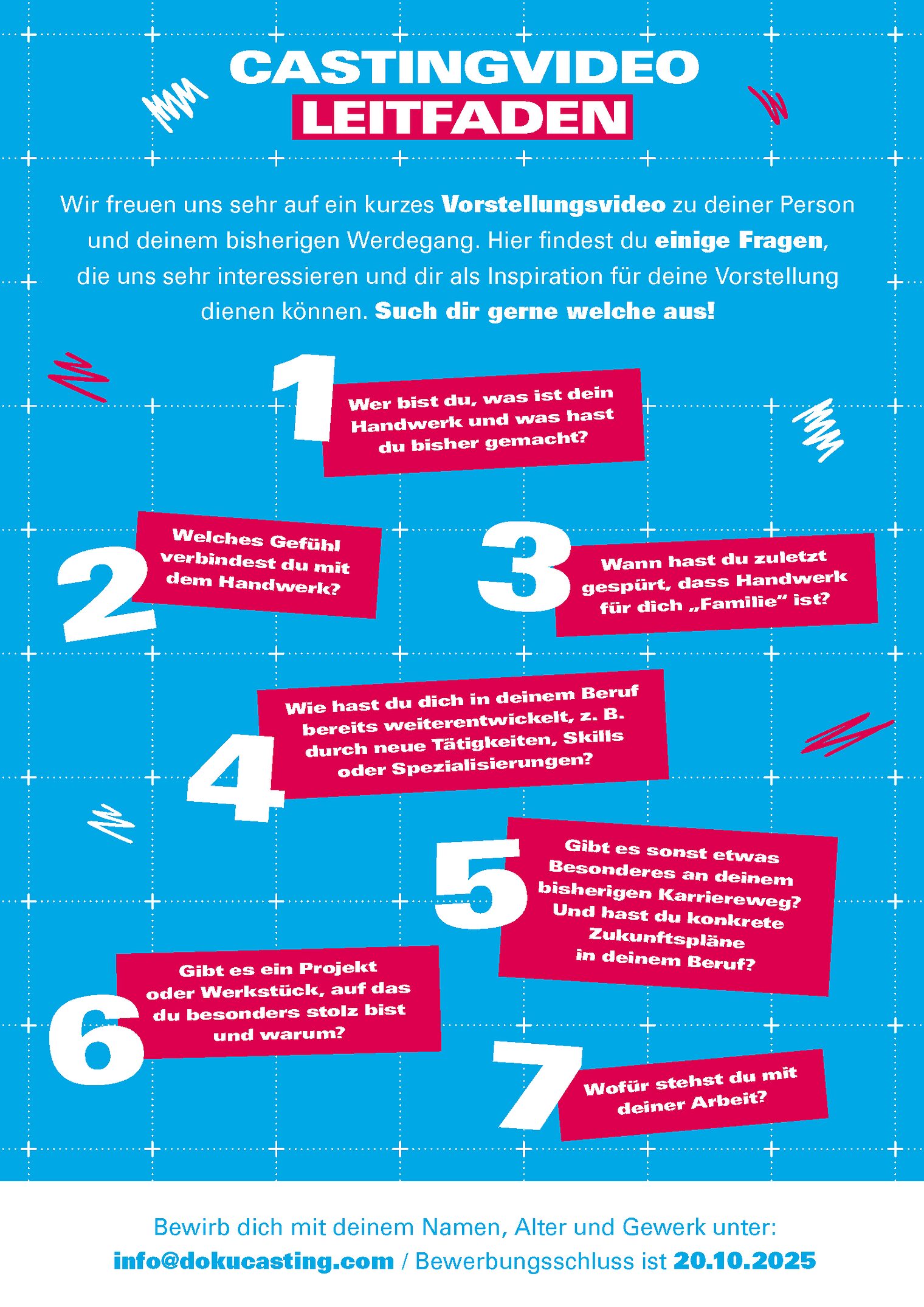 Teil unserer deutschlandweiten Kampagne werden? Eine kurze E-Mail mit Namen, Alter und Gewerk bis 20. Oktober 2025 an info@dokucasting.com schreiben. Interessenten, die Ihre Chancen erhöhen möchten, können auch ein kurzes Vorstellungsvideo aufnehmen und einsenden. Alle Infos in der Leitfaden-Grafik.