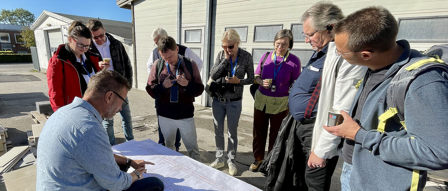 Weitere Stationen der Reise waren das Stadtentwicklungsprojekt Jernbanebyen, das auf nachhaltige Umnutzung historischer Werkhallen setzt, sowie die dänische Arbeitgeberorganisation Dansk Håndværk. Dort standen Themen wie Sanierung versus Restaurierung, Wärmedämmung und CO₂-Verbrauch im Lebenszyklus eines Gebäudes im Mittelpunkt. Ein Highlight war der Besuch bei Dansk Erhverv, wo Projektleiter Christian Sestoft wertvolle Einblicke in den Wiederaufbau der historischen Börse in Kopenhagen gab. Die Teilnehmenden erhielten detaillierte Informationen zum Stand der Arbeiten, zur Materialbeschaffung und zur Finanzierung des Großprojekts – ein praxisnaher Blick hinter die Kulissen eines der bedeutendsten Restaurierungsvorhaben Dänemarks.