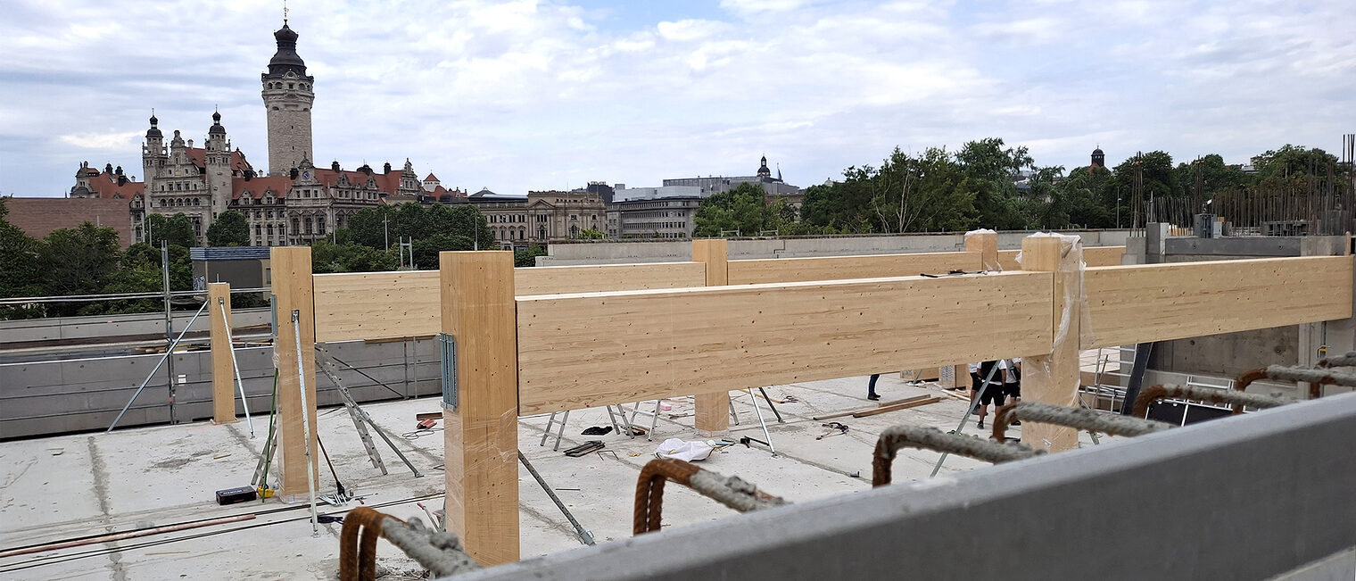 Die Baustellenbesichtigung bietet interessierten Holzbaubetrieben die Möglichkeit, Einblick in den Bauprozess des Neubaus eines fünfgeschossigen Holzhybridbaus auf dem Leipziger Wilhelm-Leuschner-Platz zu erhalten. Tristan Schmidt von der ausführenden Zimmerei Schmidt Holzbau-Ausbau GmbH und der Bauleiter des Architekturbüros Schulz und Schulz führen über die Baustelle.